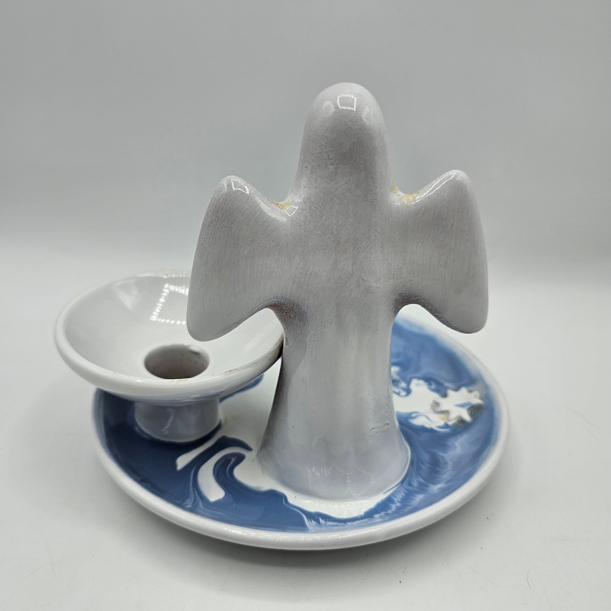 Angel Taper Candle Holder with Blue and White Drip Glaze Trinket Dish