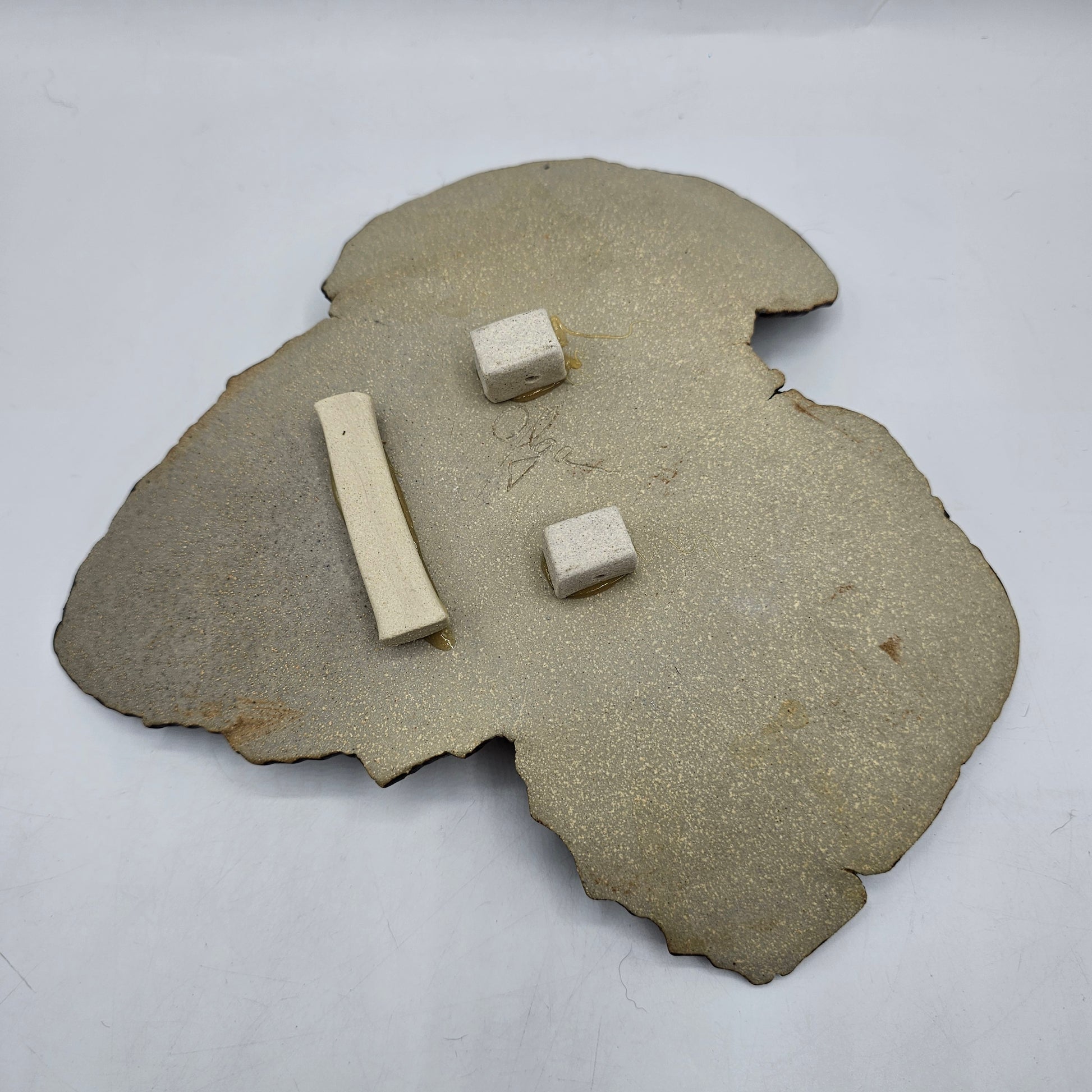 This artisan signed Art Pottery Leaf Tray features intricate gold gilt detailing. Handcrafted with care, this beautiful tray adds a touch of elegance to any home. The perfect blend of artistic craftsmanship and functionality, it makes a great addition to any collection.