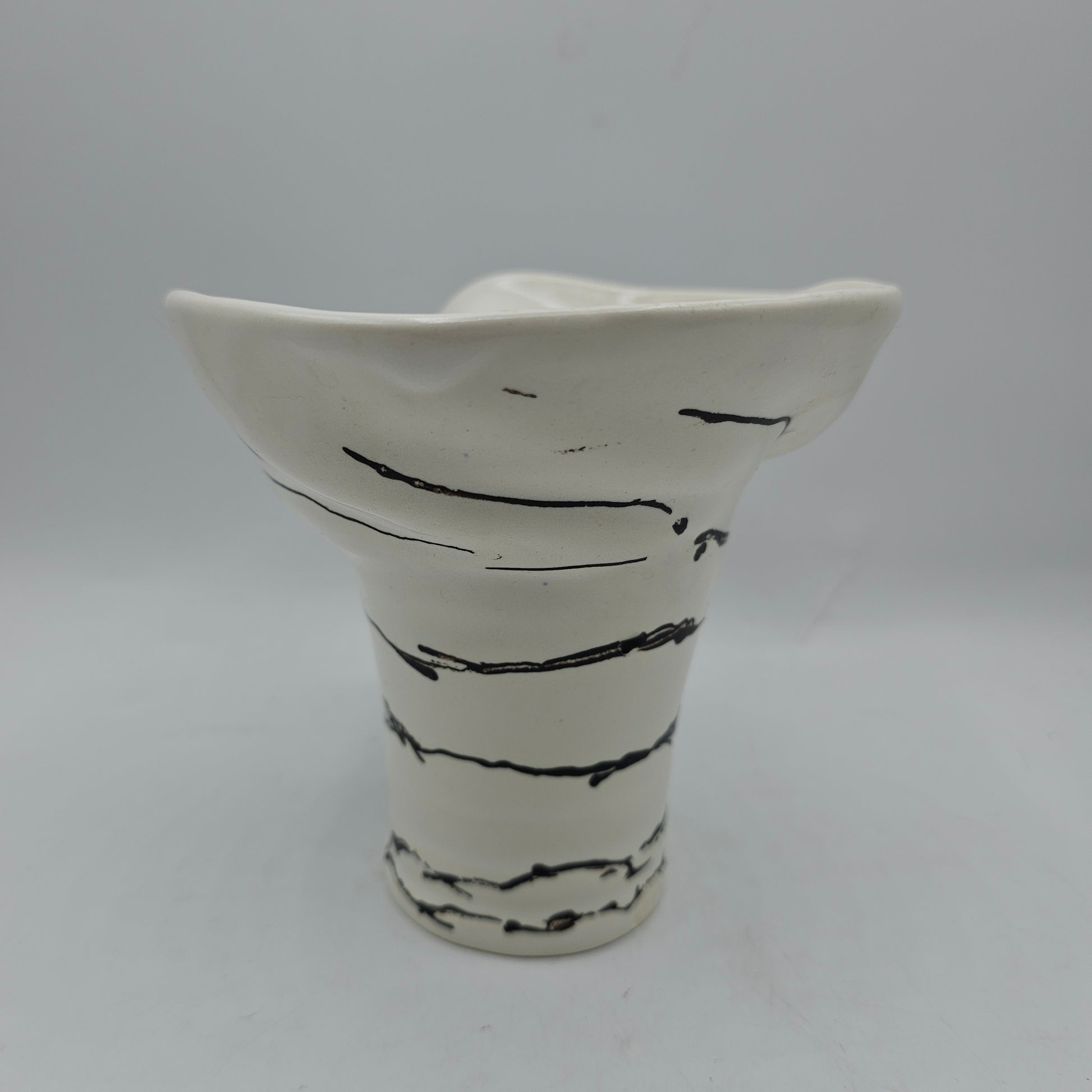 Experience the beauty and uniqueness of this Artisan Pottery Black and White Swirled Case Vase. Handcrafted and signed by Franny, each vase is truly one-of-a-kind. The swirling black and white design adds an elegant touch to any room. Elevate your home decor with this stunning piece of pottery.