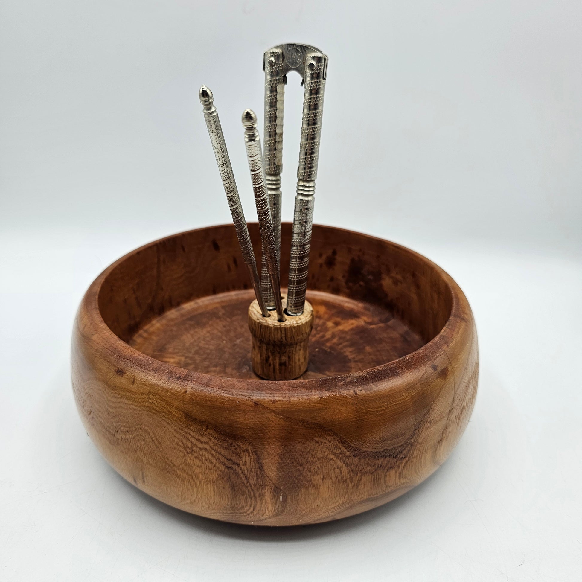 This set includes a beautifully crafted carved teak wood nut dish, along with sturdy metal nut crackers and two nut picks. The luxurious teak wood adds an elegant touch to your table setting while the durable nut crackers and picks make it easy to enjoy your favorite nuts.
