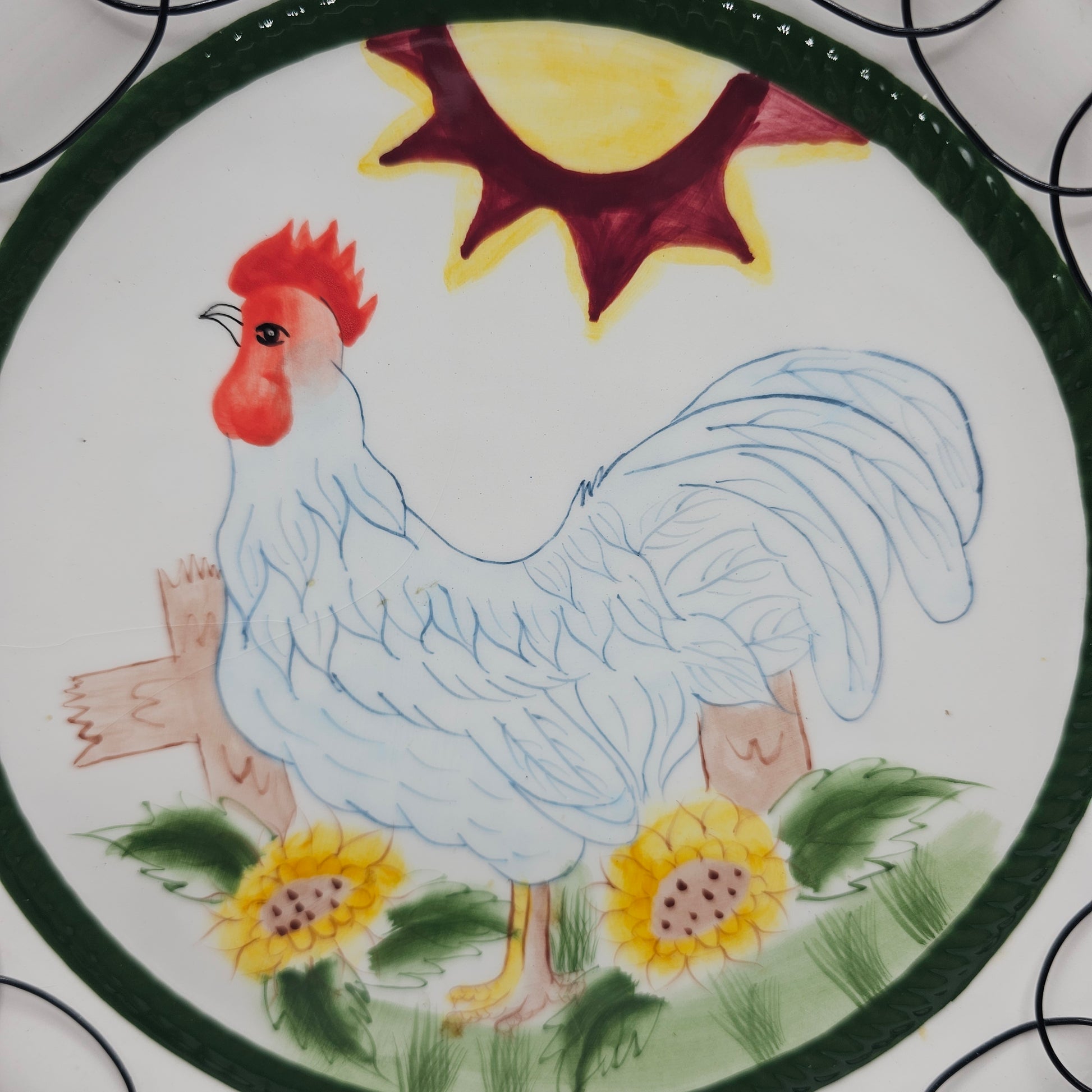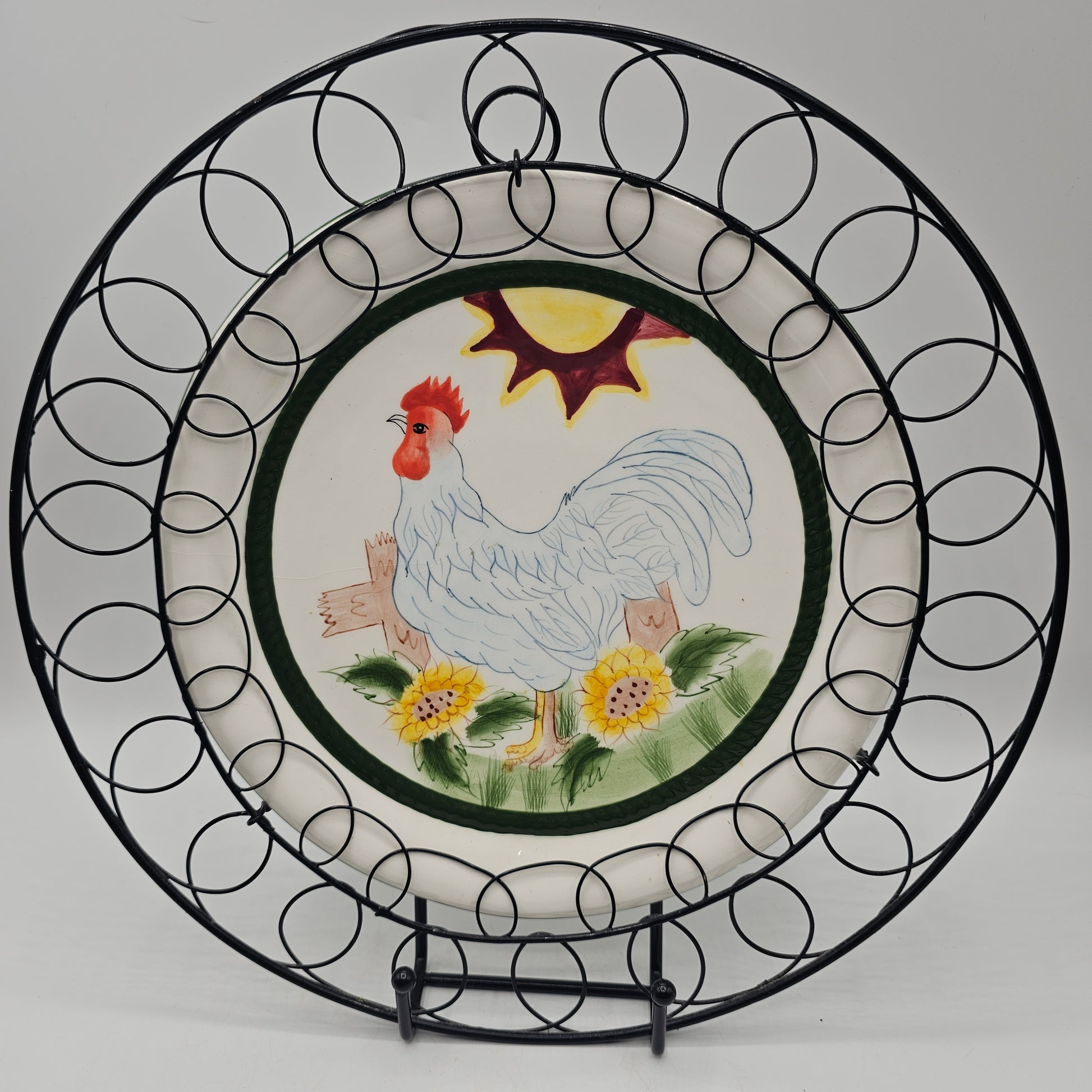 Plate itself measures 8" in diameter, 11" with wire hanger.