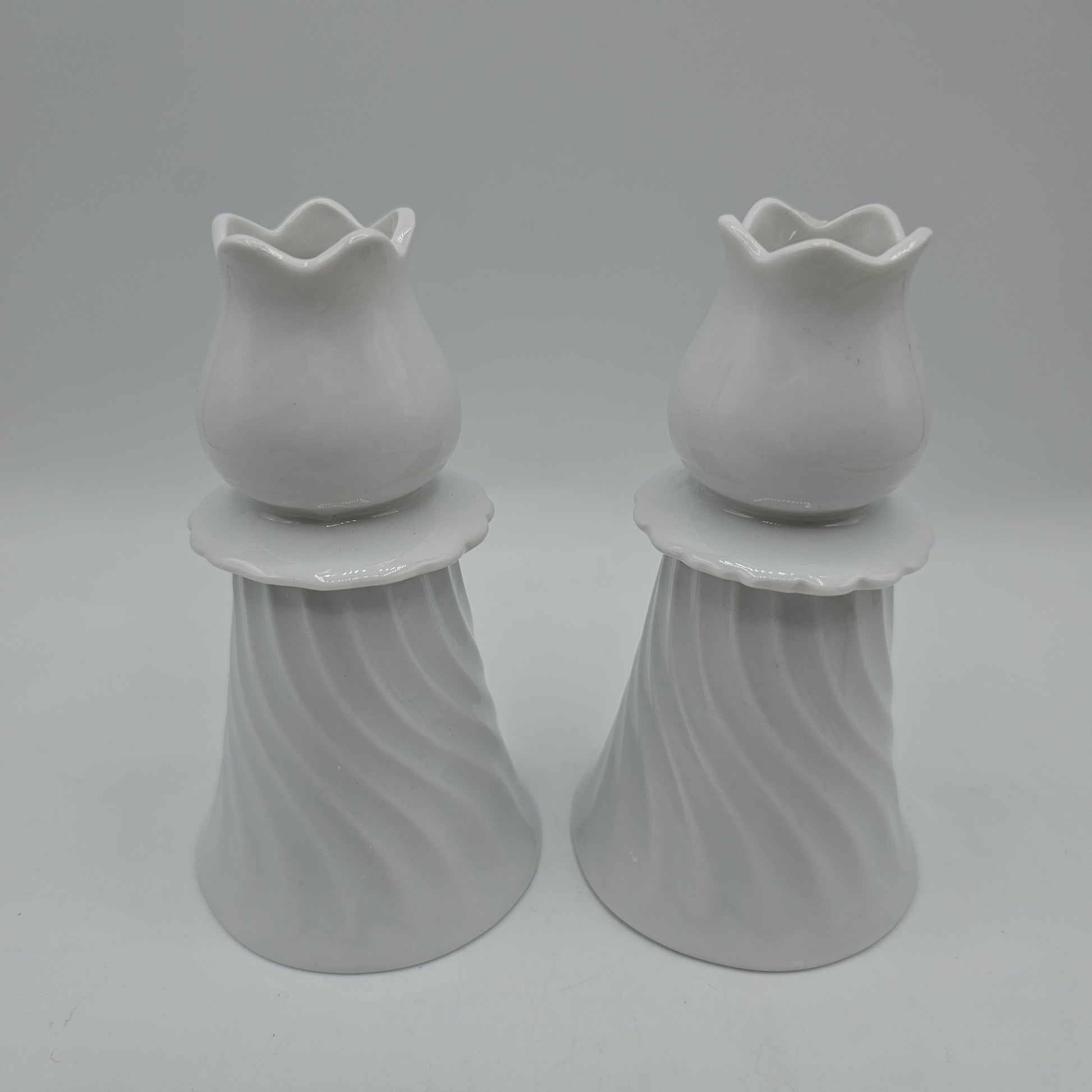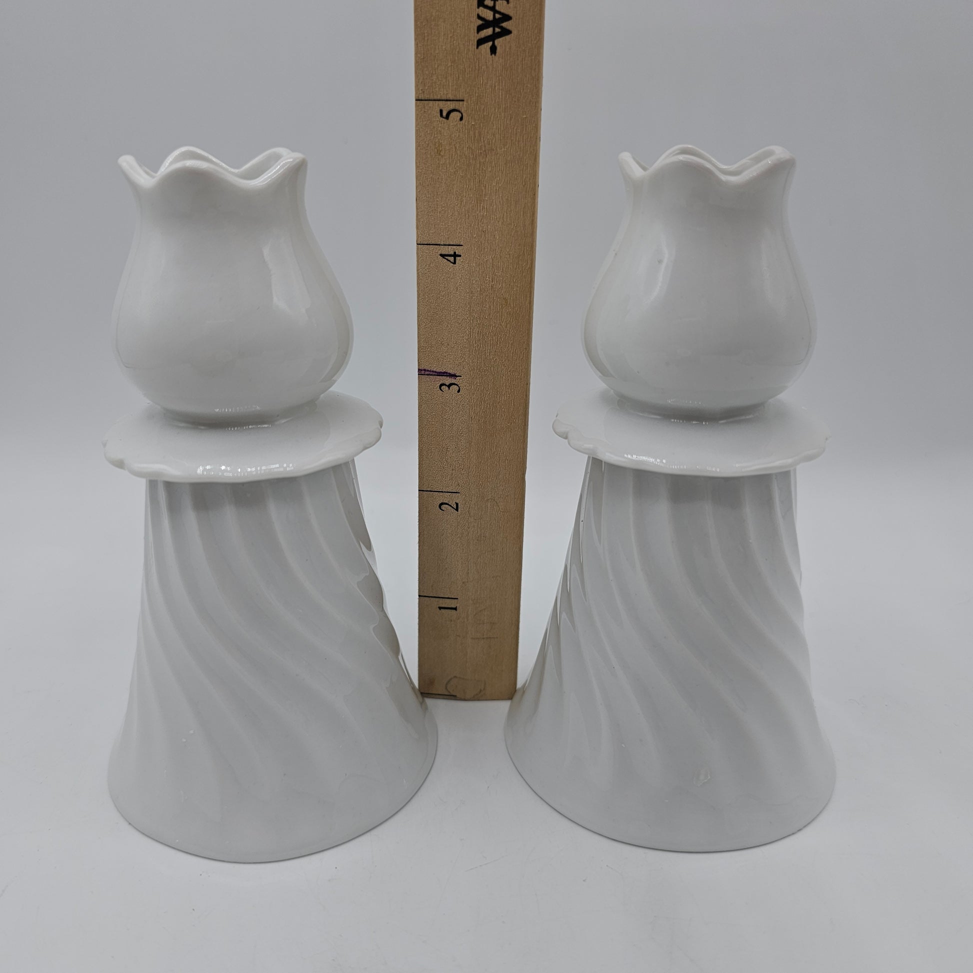 Double Sided White Ceramic Candlesticks with Tulip Top and Swirl