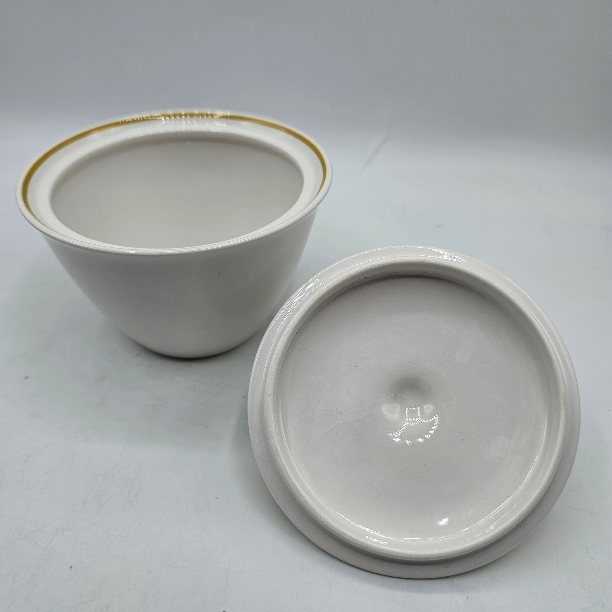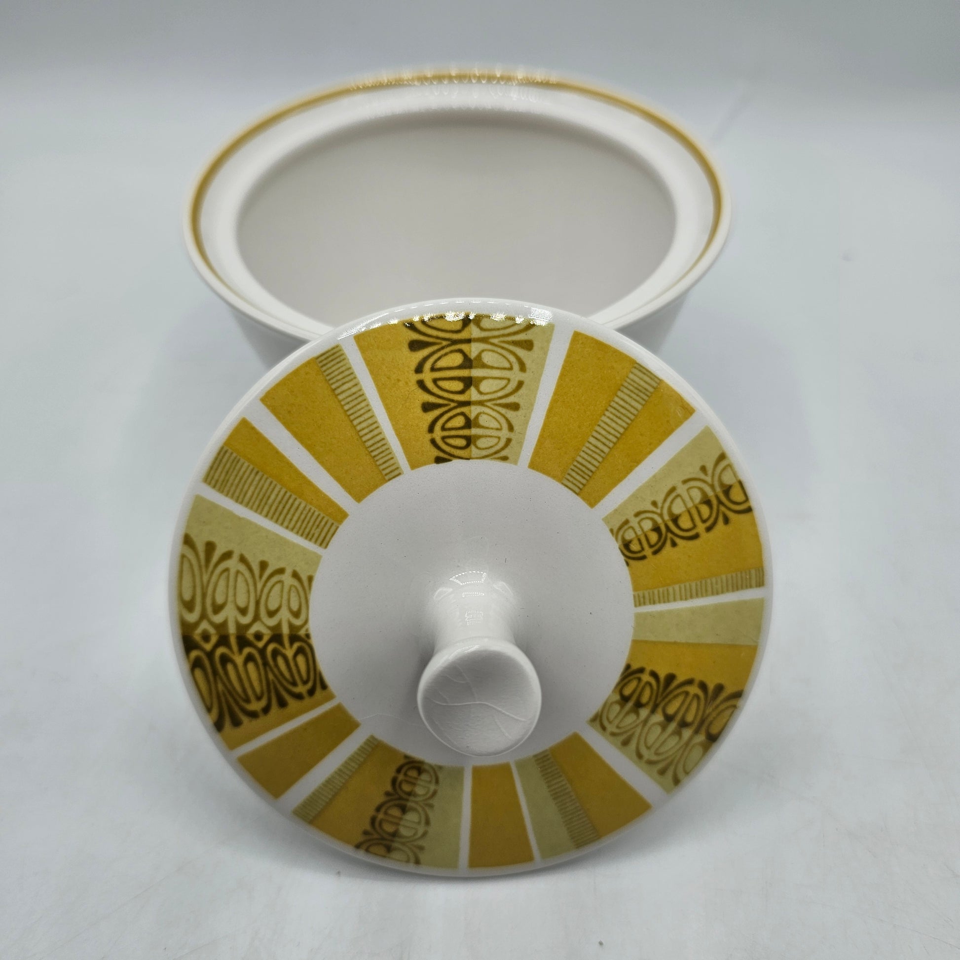 Franciscan Whitestone Ware Antigua Interface Lidded Sugar Bowl Mid Century Modern Mustard Yellow Brown Design