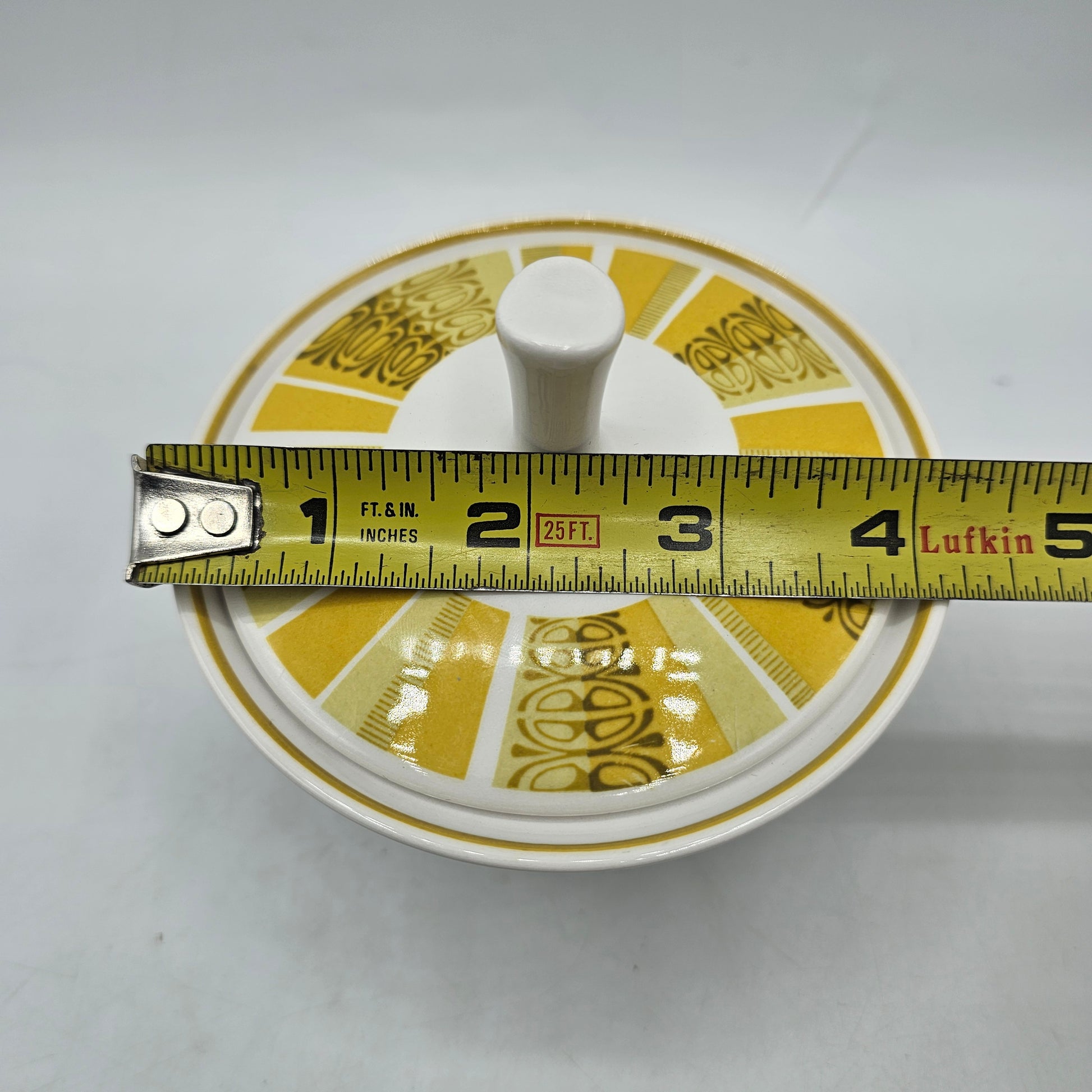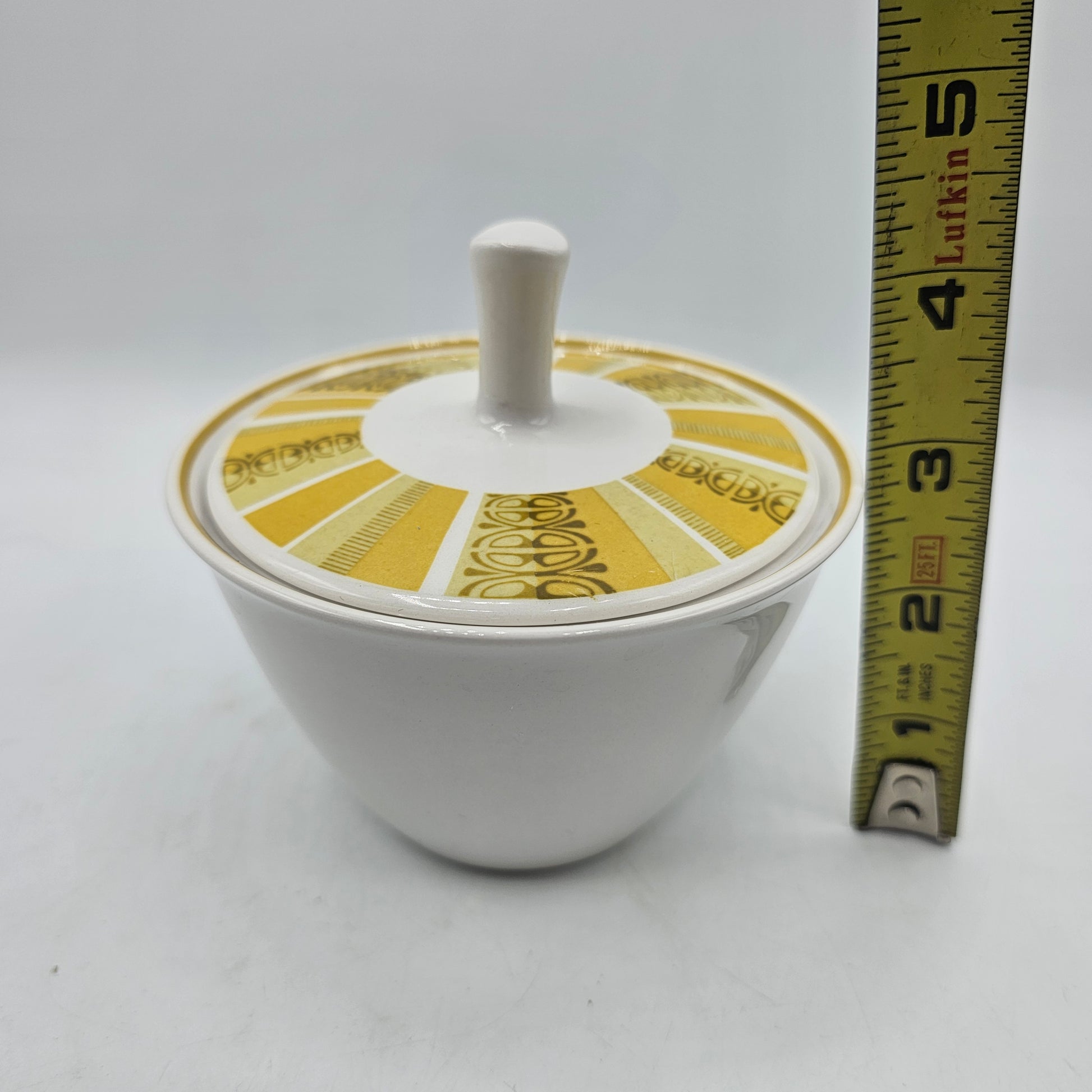 Expertly designed and crafted, this lidded sugar bowl from Franciscan is part of the Whitestone Ware Antigua Interface collection. With a mid-century modern mustard yellow and brown design, it adds a touch of sophistication and functionality to your table. Made with durable and high-quality materials, this sugar bowl is built to last. Add it to your collection now!