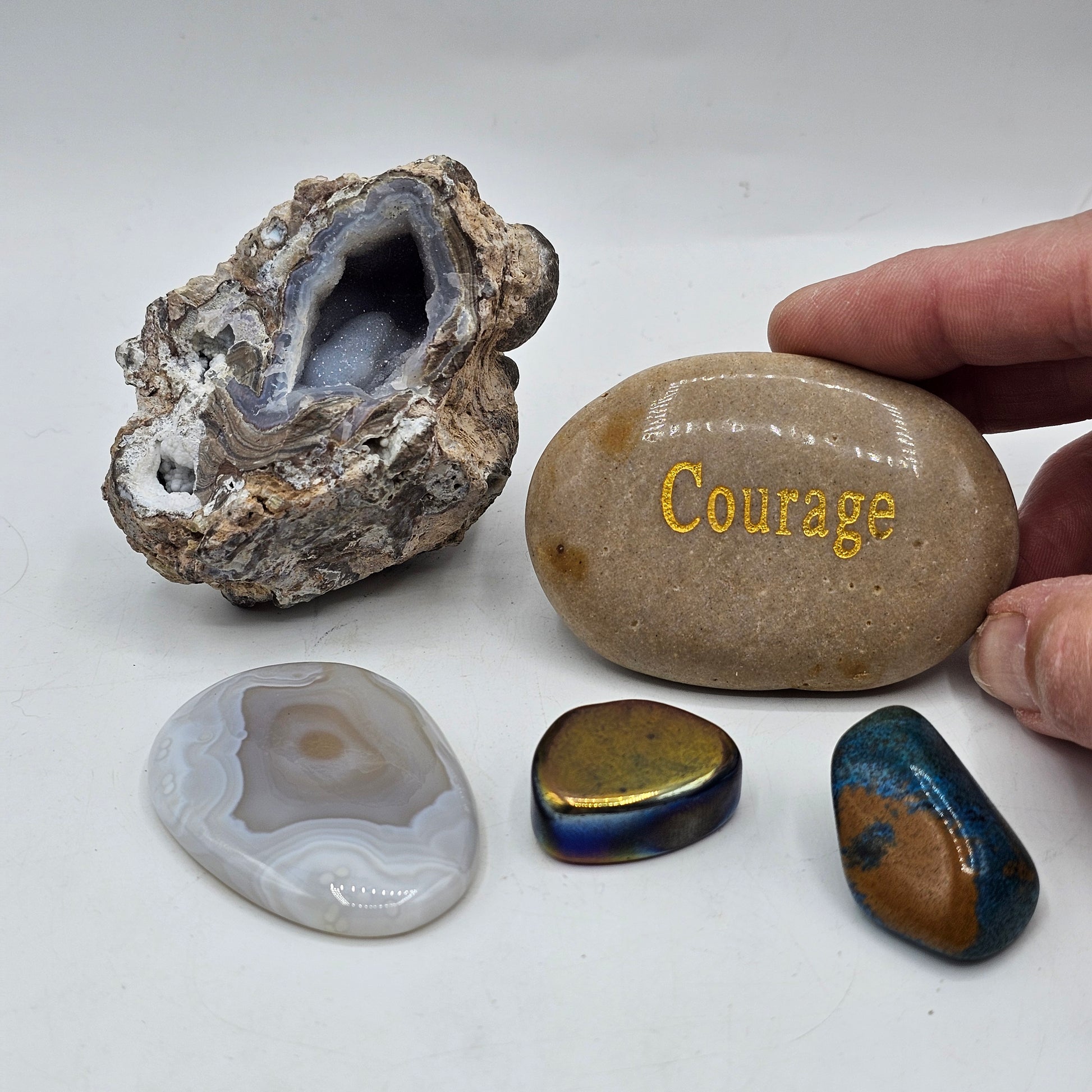 Enhance your inner strength with our Geode Rock, "Courage" Stone, and 3 Worry Rocks set. These natural and unique stones promote courage and reduce stress, making them perfect for meditation or carrying in your pocket. Trust in the power of nature and overcome your worries.