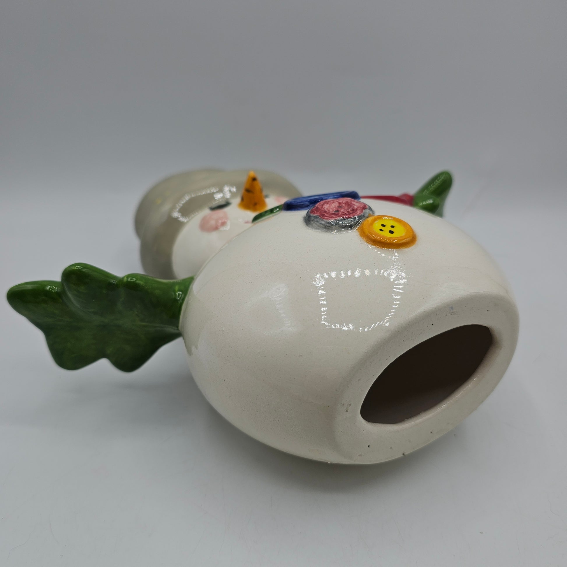 Expertly hand-painted and crafted from high-quality ceramic molds, our Snowman Figure with Buttons signed Duncan Ent 1995 is a festive addition to your holiday decor. The traditional snowman design, complete with charming buttons, adds a touch of whimsy to any room. Each piece is unique, making it a special and timeless piece for your home.