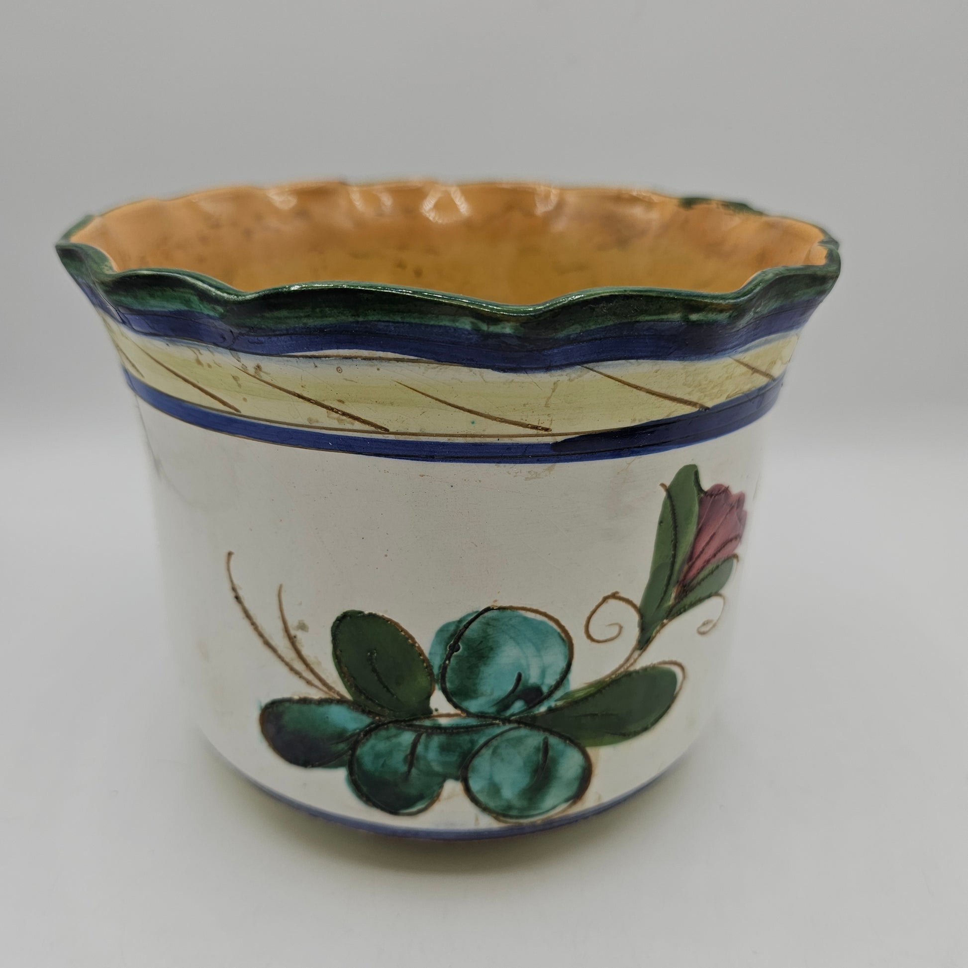 Italian Hand Painted Majolica Style Ceramic Floral Planter with Sgraffito Detail