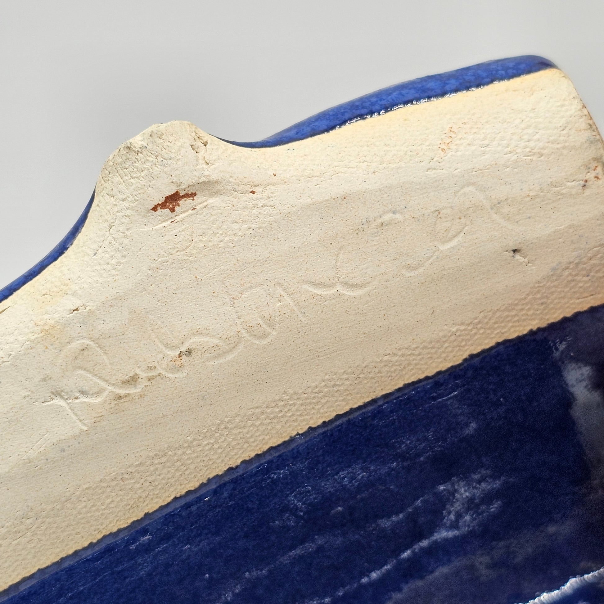 Self Draining Art Pottery Blue Patterned Sponge Holder or Soap Dish - Artisan Signed