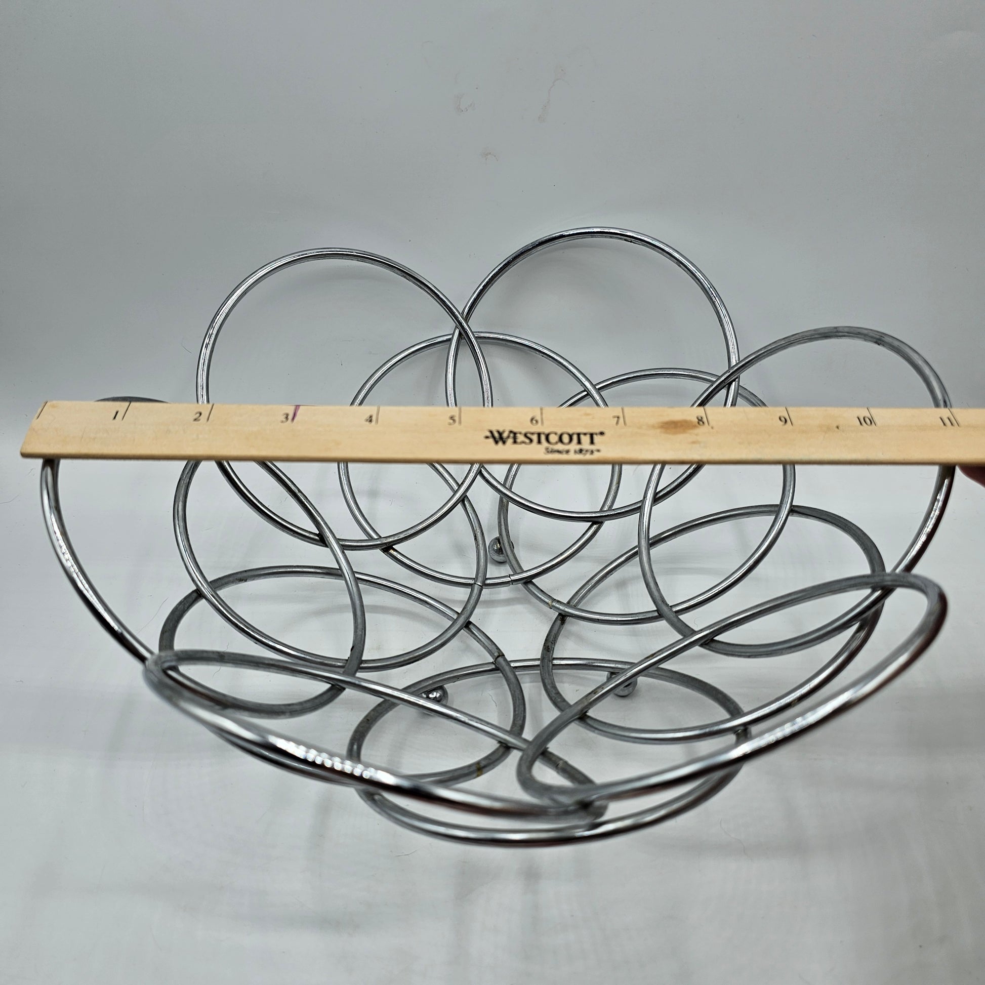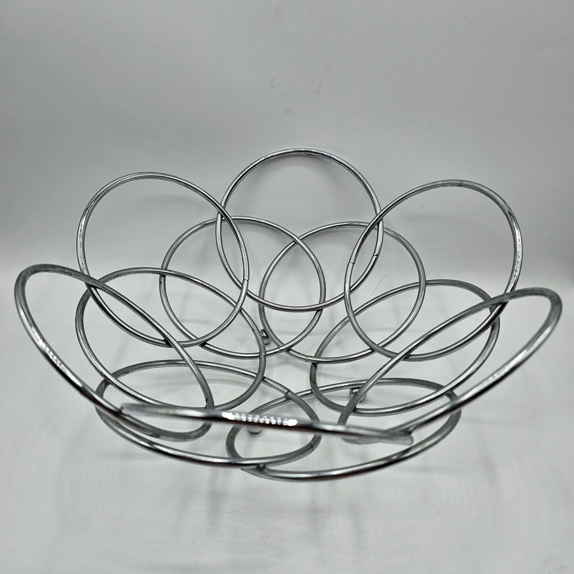 This Silver Tone Metal Rings Mid Century Modern Fruit Bowl is a practical and elegant addition to any kitchen. The sleek, modern design features silver tone metal rings that not only add a contemporary touch but also provide sturdy support for your fruits. Keep your kitchen organized and stylish with this versatile fruit bowl.