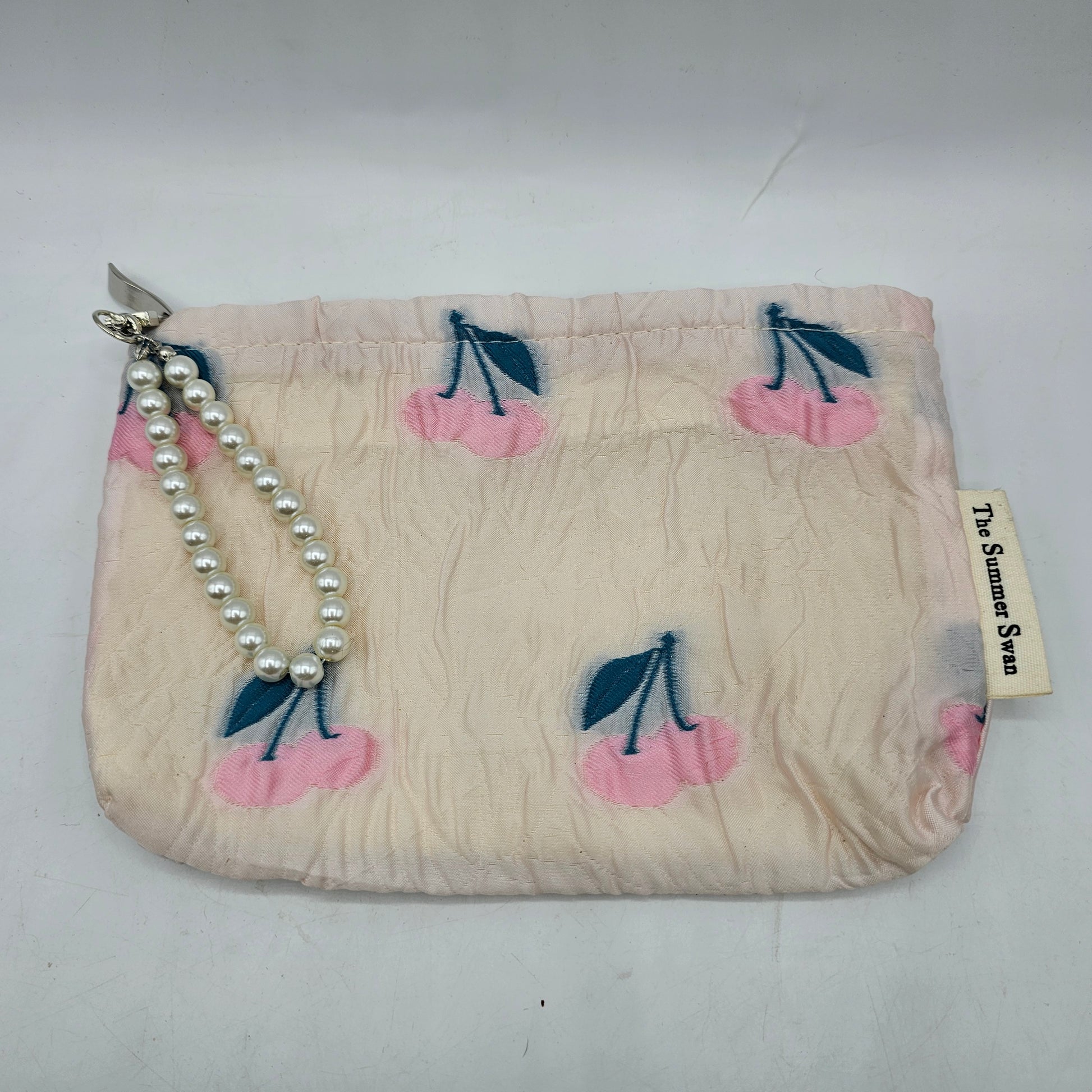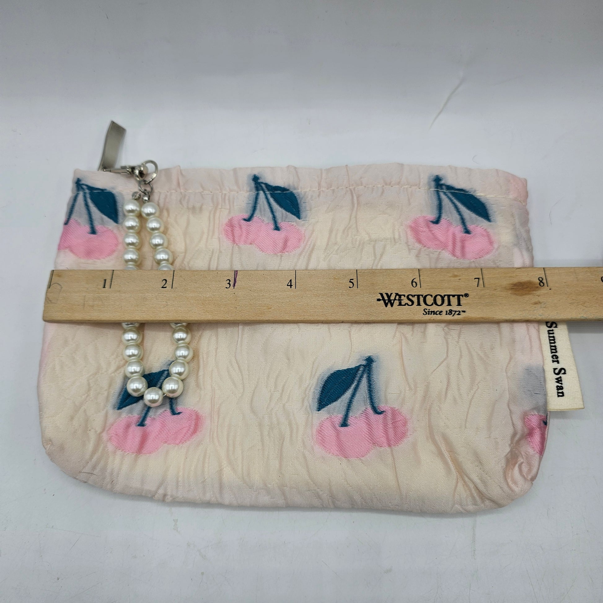 The Summer Swan Pink Zip Up Wristlet Purse / Make Up Bag with Cherries and Faux Pearl Pull Handle
