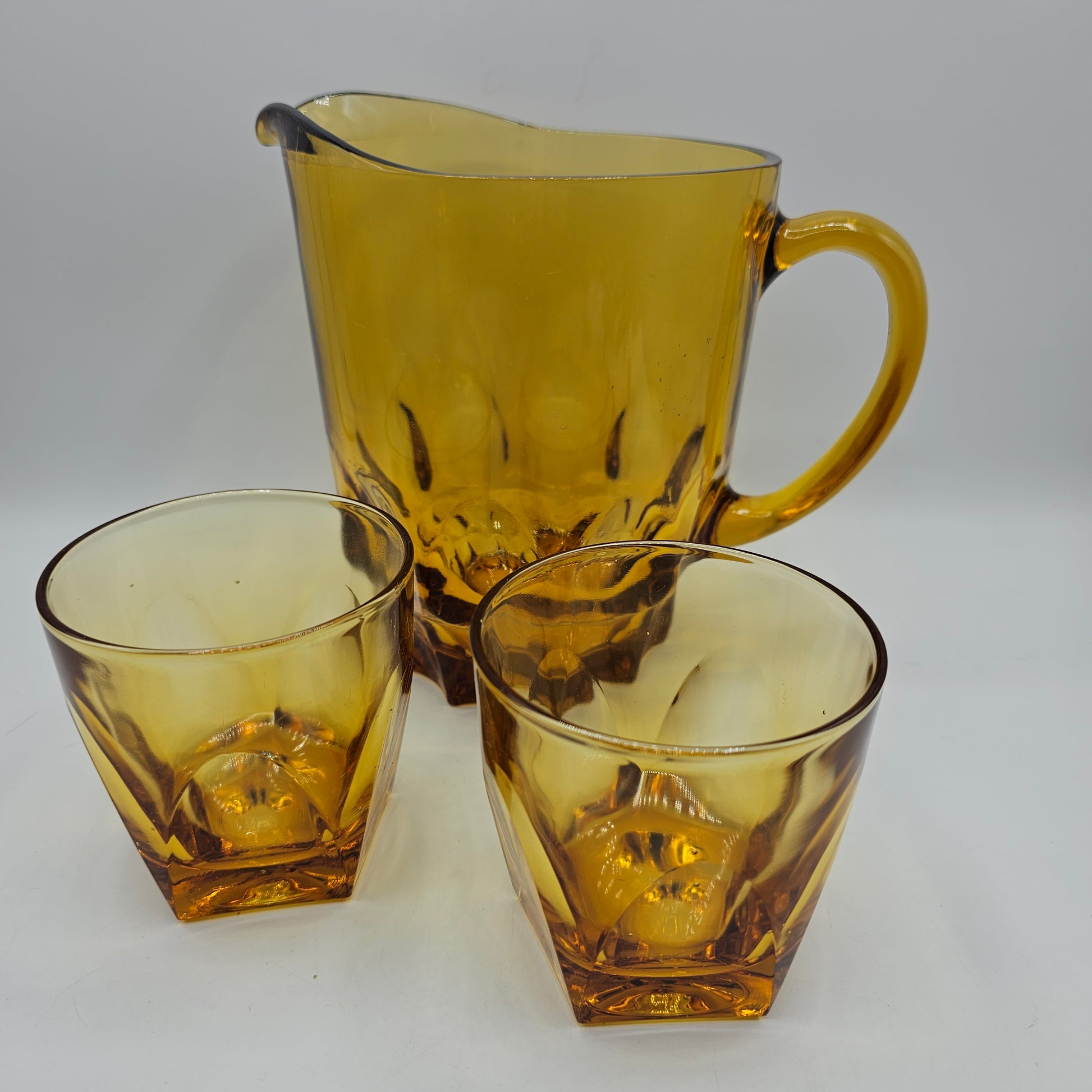 This set includes a vintage amber glass pitcher and two glass tumblers. Made with expert craftsmanship, these pieces add a touch of elegance to any dining experience. The amber color adds a sense of warmth and charm, making it perfect for both daily use and special occasions.
