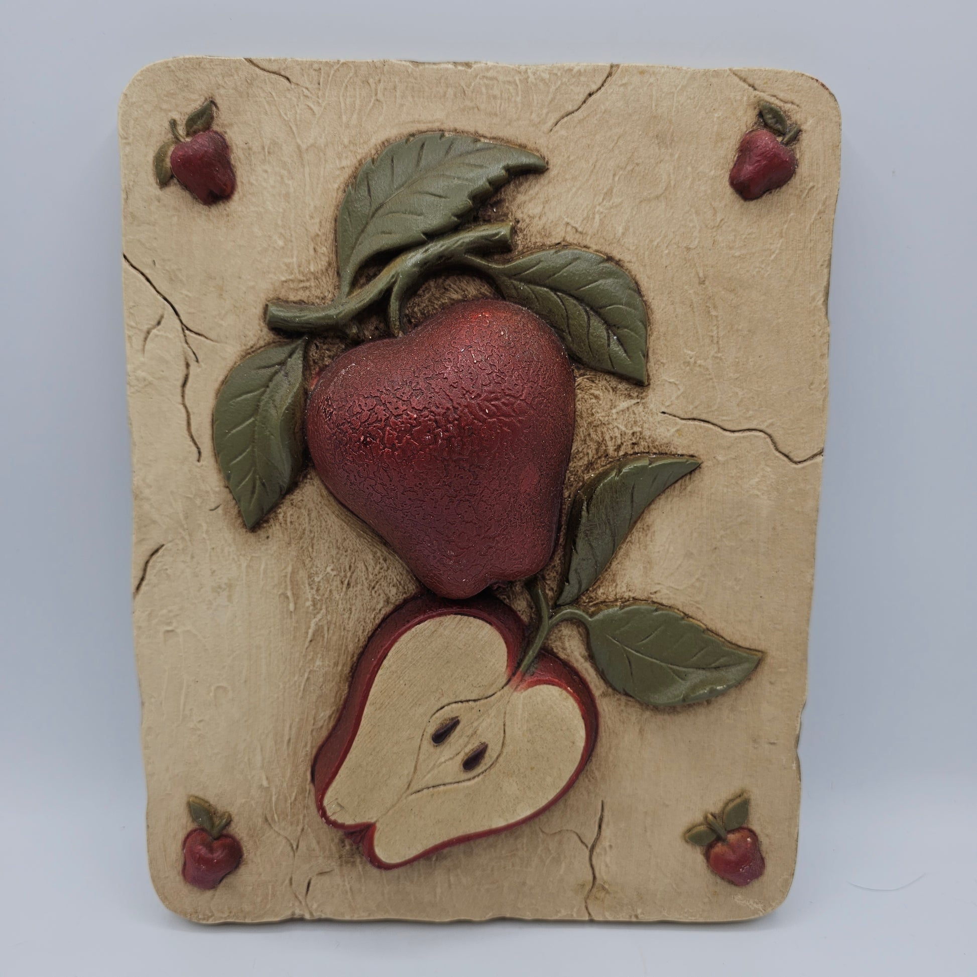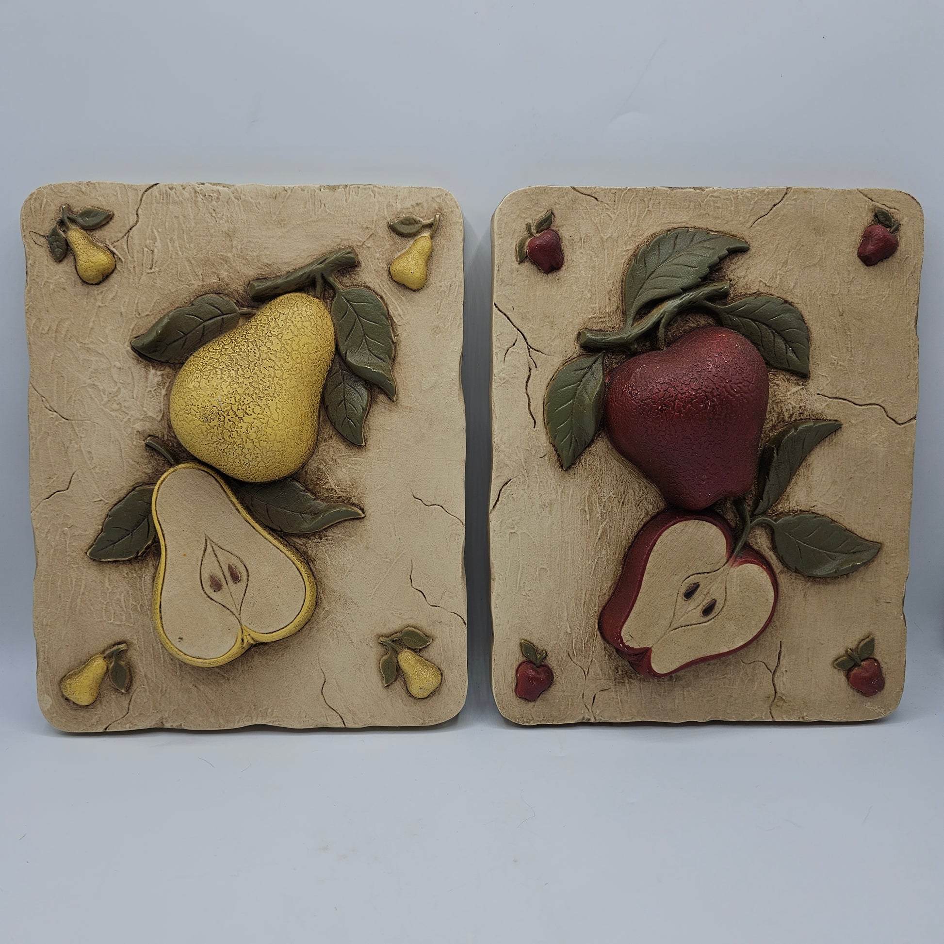 Enhance your home decor with our Vintage Apple and Pear Fruit Wall Plaques by Home Interiors "Homco". Made with expert craftsmanship, these hard plastic plaques feature a timeless design that adds a touch of vintage charm to any room. The perfect combination of style and functionality, these plaques make for a beautiful addition to your home.