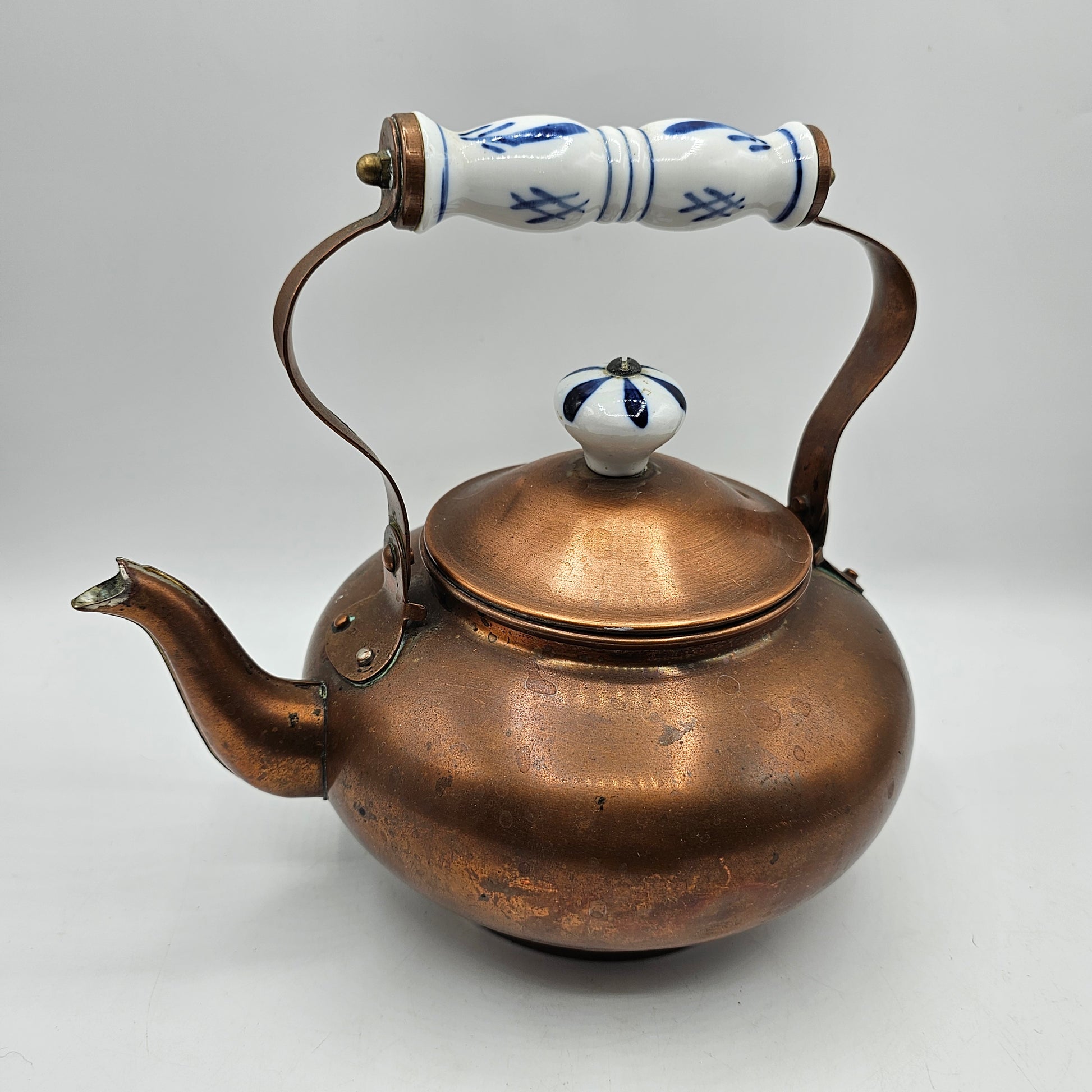 Vintage Copper Tea Kettle with Delft Blue Porcelain Handles