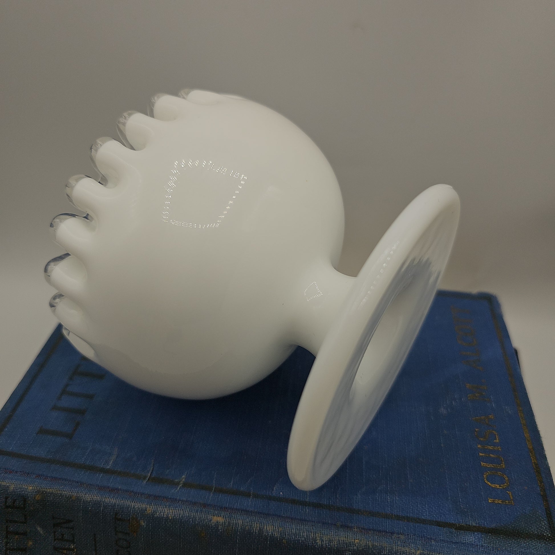 Milk Glass with pedestal and clear ruffle. Measures 3.5" high.