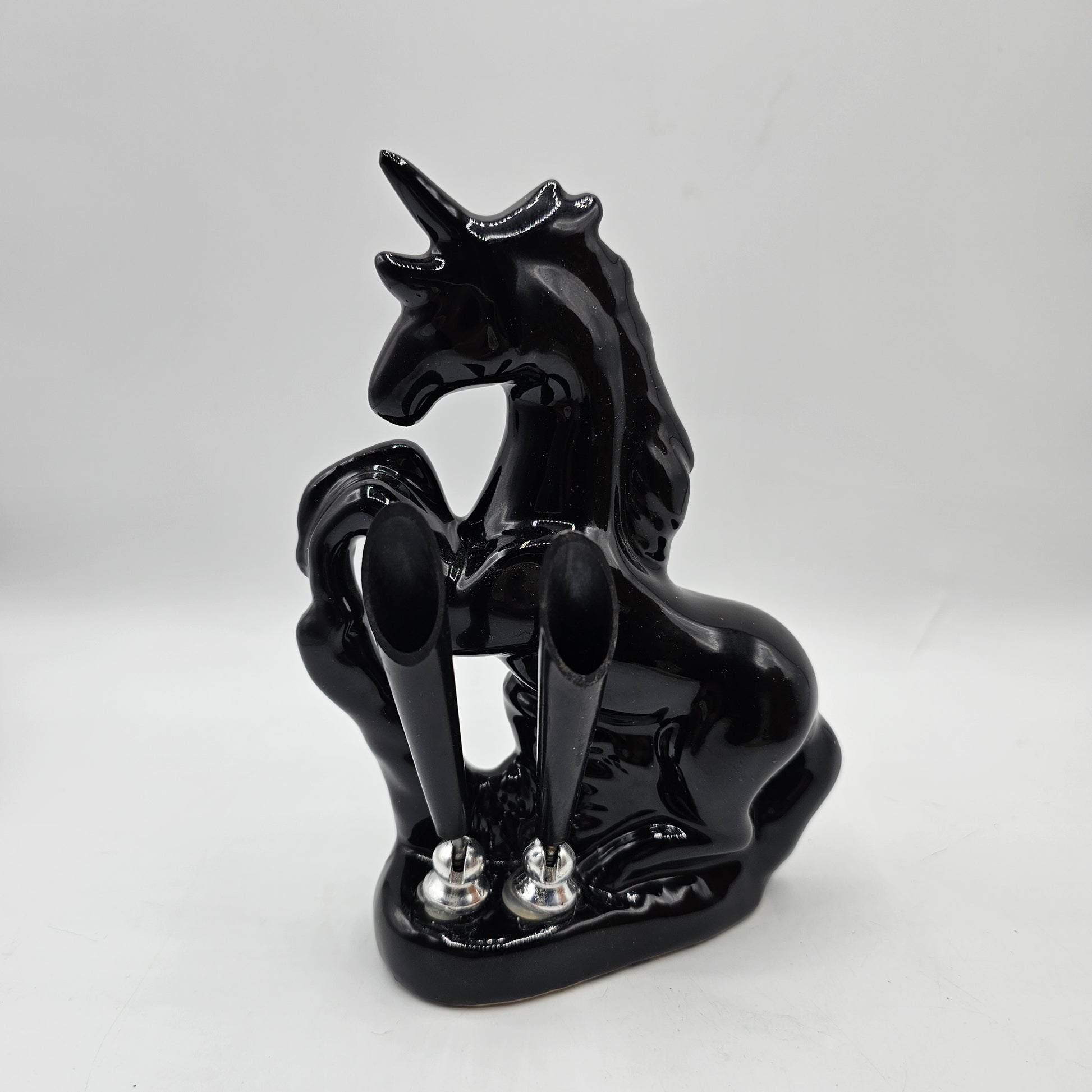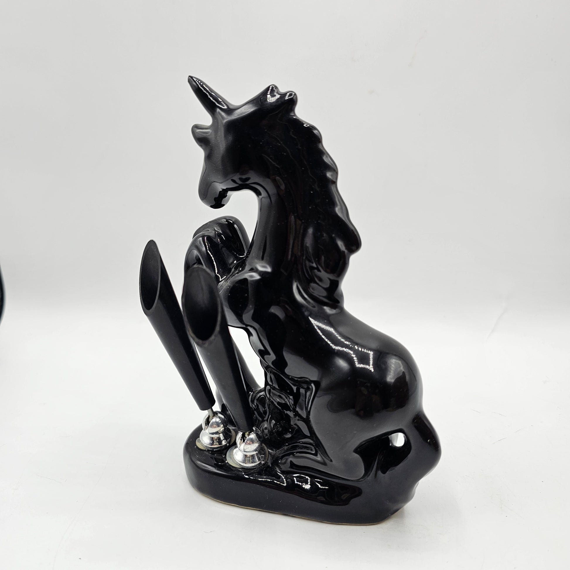 This vintage glossy black ceramic horse 2 pen holder/desk accessory combines functionality and style. With its sleek design and sturdy construction, it is the perfect desk accessory for any horse lover or collector. The holder can hold two pens, keeping your workspace organized and elegant.