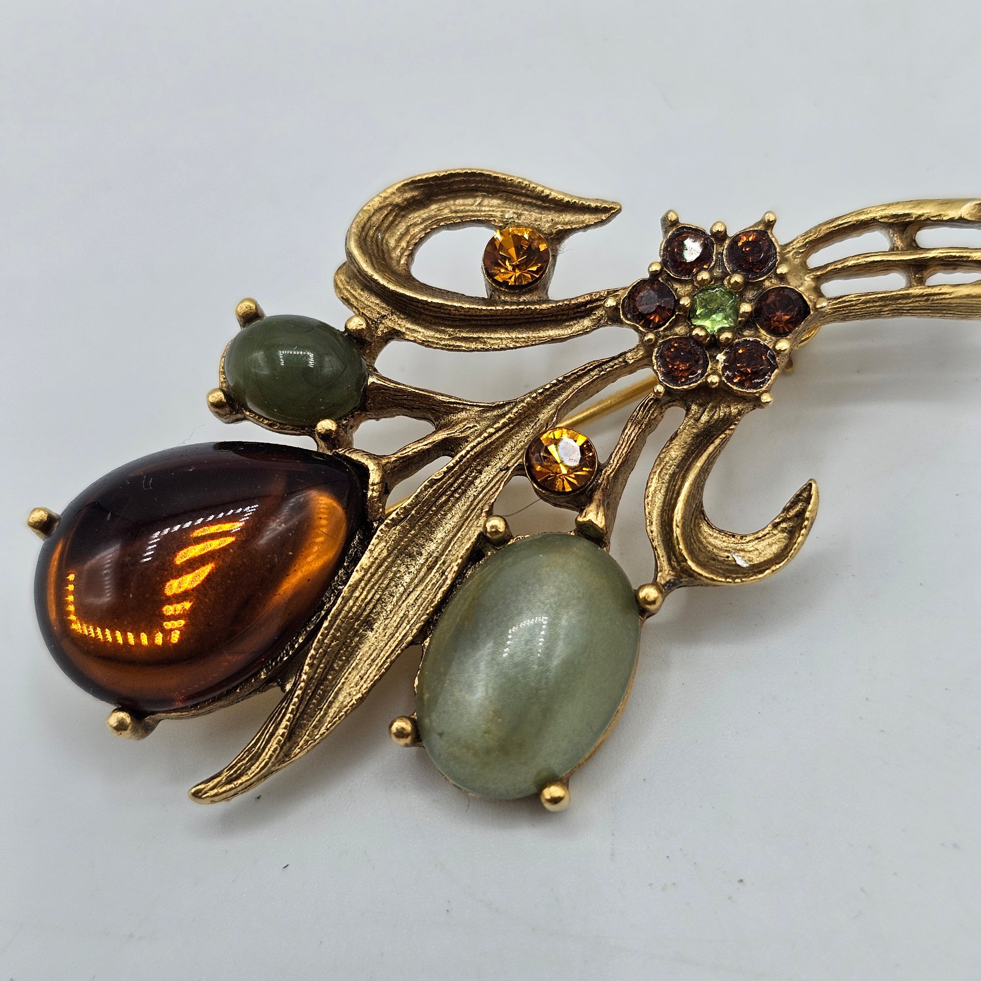 This vintage gold tone flower bouquet brooch features stunning amber jade glass cabochons and sparkling crystal rhinestones. The pin back allows for versatile wear. Add a touch of vintage elegance to your outfit with this unique and eye-catching accessory. Perfect for any occasion.