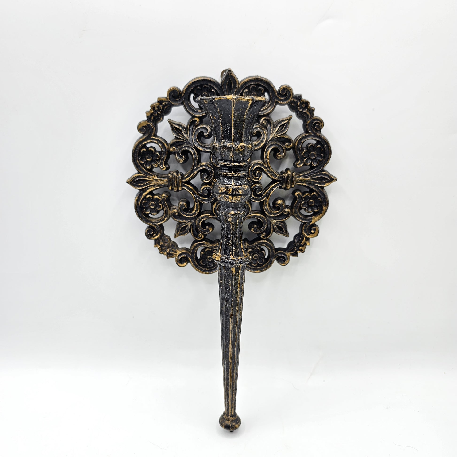 Enhance your home decor with this vintage Homco/Home Interiors taper candle holder sconce. Made with burnished gold molded plastic and expertly crafted in the USA, this piece will add a touch of elegance to any room. Perfect for creating a warm and inviting atmosphere for your next dinner party.
