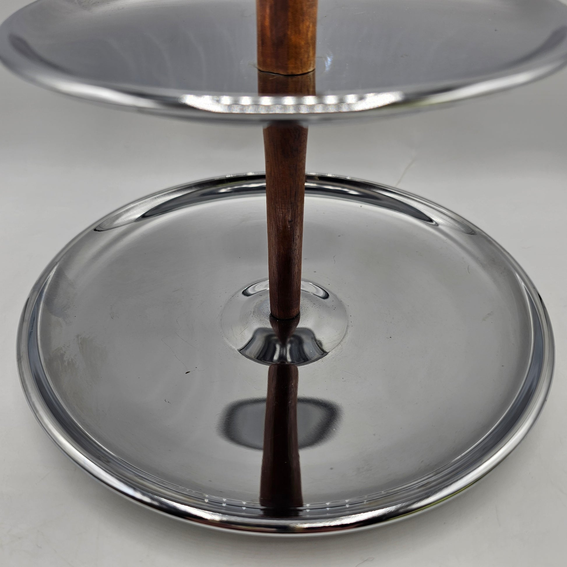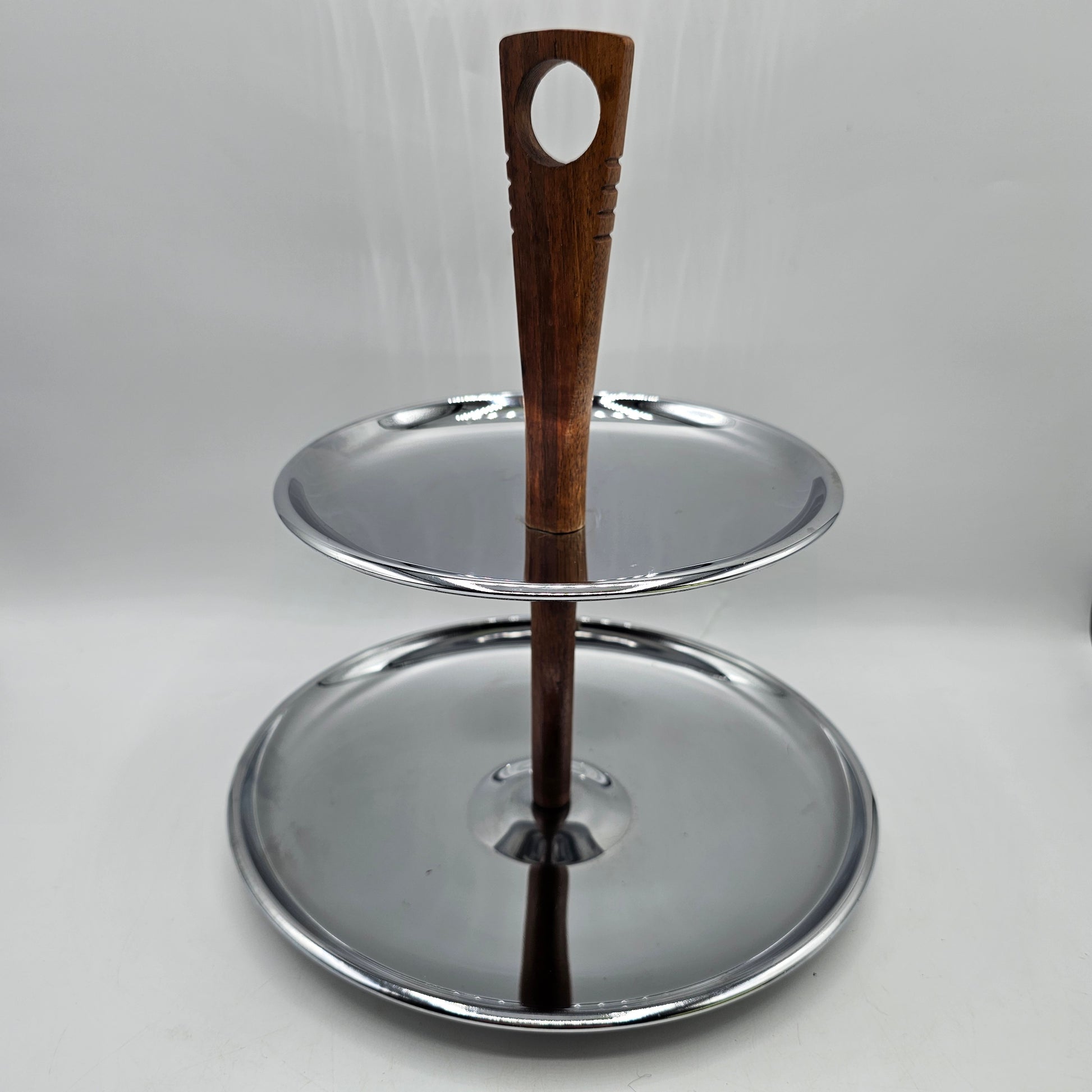 1960's Kromex Chrome 2-Tiered Tidbit Tray or Bathroom Stand with Teak Wood Handle