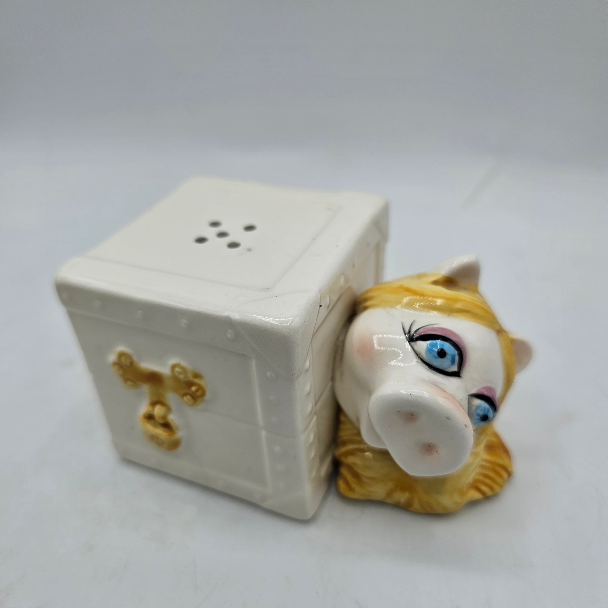 This set of vintage Sigma porcelain salt and pepper shakers features a charming design of Kermit the Frog dressed as a magician sawing Miss Piggy in half. Made in Japan in 1972, these shakers are in excellent condition and a unique addition to any Muppets or vintage kitchen collection.