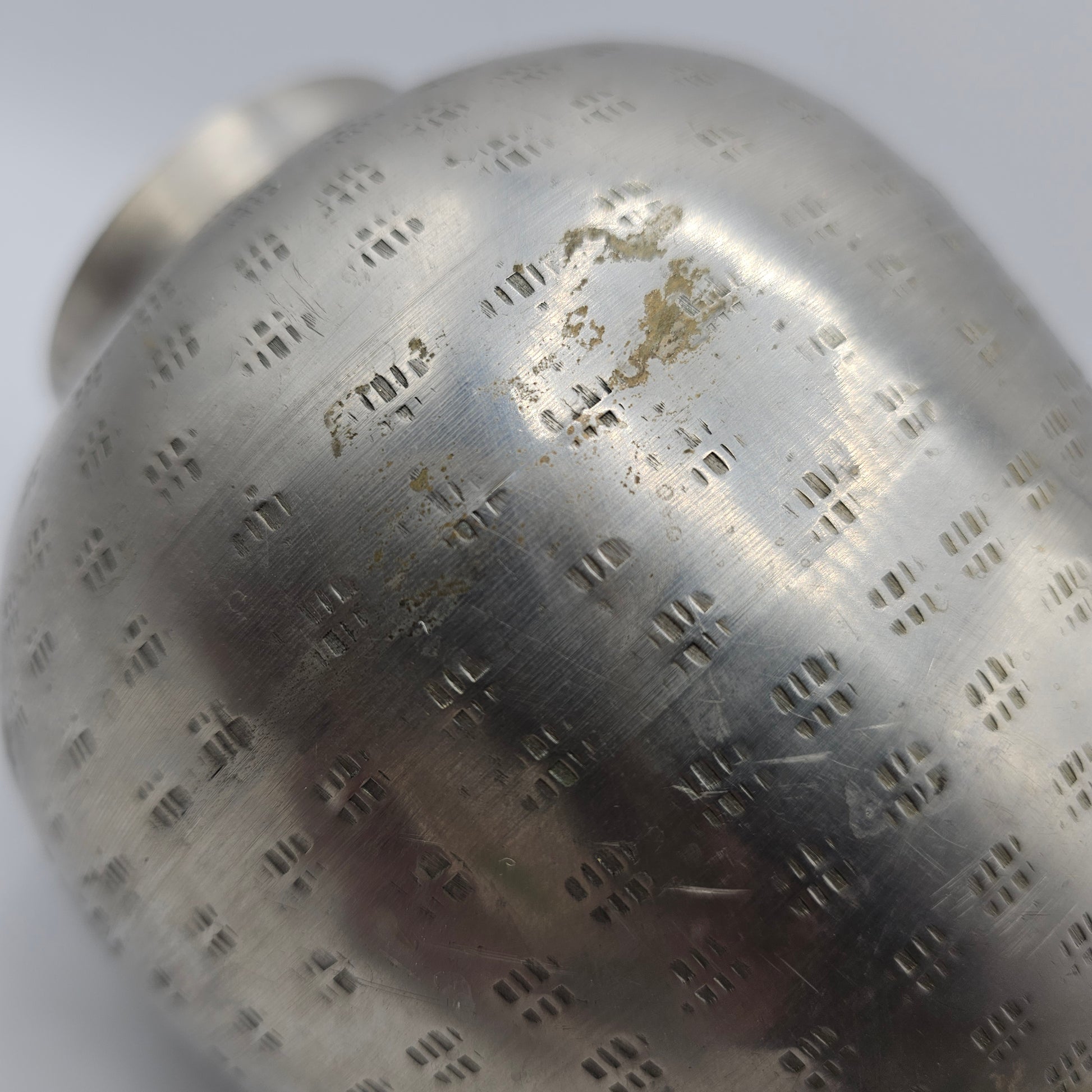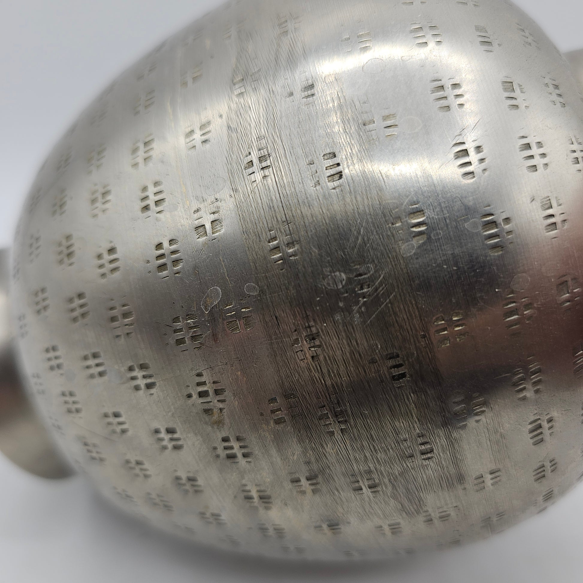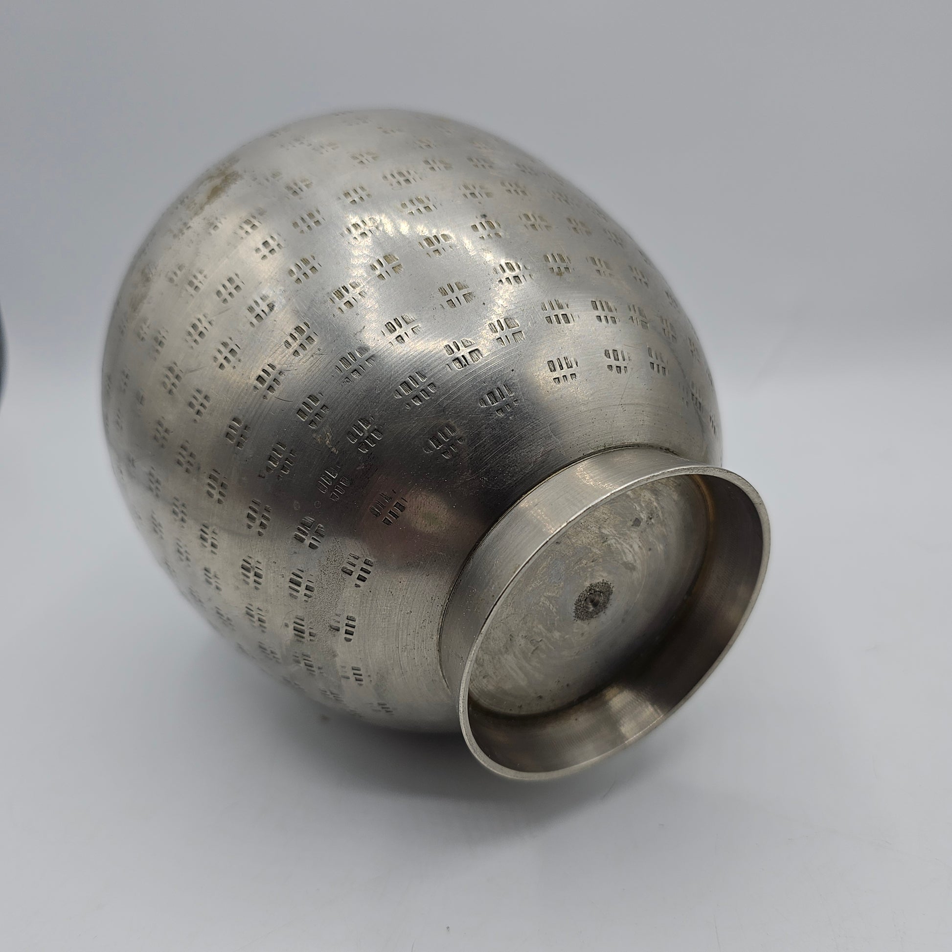 Enhance your home decor with the Vintage Silver Tone Metal Vase. Crafted with intricate etched design, this vase adds an elegant touch to any room. Made from high-quality materials, it's built to last and will bring a timeless charm to your space. Elevate your interior with this beautiful and unique piece. Please note imperfections as shown in pictures.