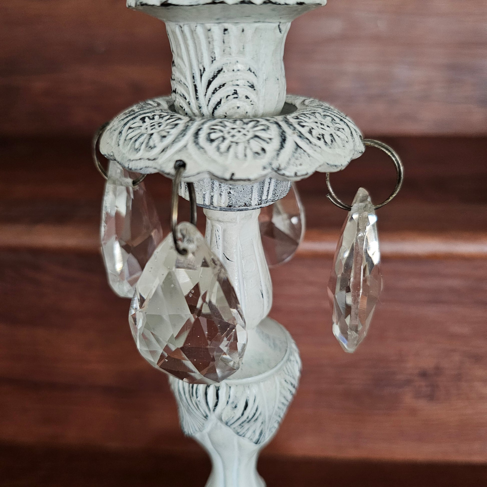 This vintage white metal candlestick features elegant glass prisms and an etched glass peg shade, adding a touch of sophistication to any space. The perfect addition to your home decor, it creates a warm and inviting atmosphere for cozy evenings. Bring a touch of vintage charm to your living space with this exquisite candlestick.
